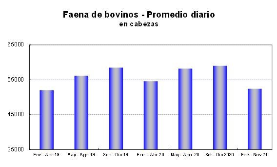 De acuerdo a datos proporcionados por la Dirección Nacional de Control Comercial Agropecuario (DNCCA), en Noviembre de 2021, la faena de bovinos alcanzó 1.1 millones de cabezas, similar en número al mes anterior, aunque registró una caída al considerar el promedio diario.