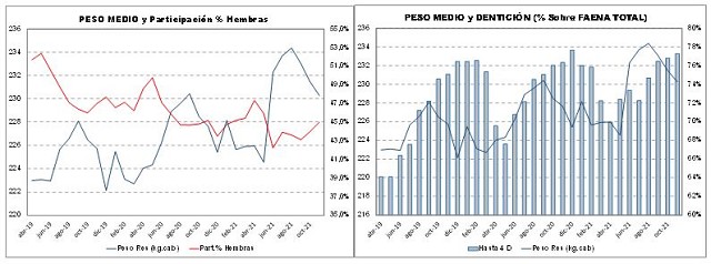 “El peso medio de los bovinos faenados aumentó en el curso de este año. A noviembre de este año fue calculado en 210 kg/cabeza para las hembras y 245 kg/cabeza para los machos, en ambos casos superan los guarismos de 2020, consecuencia de una reducción en el sacrificio de hembras y de la menor presencia de animales más livianos, que se dio a comienzos de este año. El resultado de ello es un valor promedio de 228 kg/cabeza, 2 kg mayor a la media de 2020, aunque la evolución de los últimos meses ha desacelerado este proceso virtuoso, que podría llevar a un genuino incremento de la oferta de carne, revirtiendo uno de los principales factores del estancamiento de nuestra industria de ganados y carnes, en comparación con otros proveedores del mundo”, indica Ravettino.