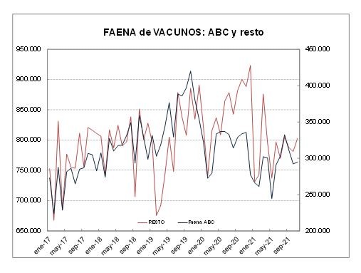“Como se comentara, al tomar en cuenta la cantidad de días hábiles, la faena registró una baja en el curso del período analizado, tanto en relación a octubre como respecto de doce meses atrás, tratándose de uno de los niveles menores para un mes de noviembre de los últimos años. La disminución de la actividad en los establecimientos faenadores se ha acentuado desde setiembre, observándose un promedio de faena 11% menor al verificado en 2020. Todo indica que el período cerrará con una faena total que estará alrededor de un millón de cabezas por debajo del año precedente”, indica Mario Ravettino, Presidente del Consorcio de Exportadores de Carnes Argentinas (ABC).
