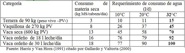 Mientras que, el ganado de carne con buenas ganancias de peso y estado corporal, en esa misma época, puede consumir 2 a 2.5 l de agua por kilo de alimento seco, es decir, una vaca de cría puede consumir entre 20 a 25 l de agua/vaca/día y un novillo de 380-400 kg entre 25 a 30 l de agua/novillo/día.