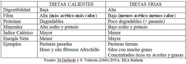 En los sistemas pastoriles (carne o leche) se utiliza en la época estival pasturas o verdeos de verano que, en general, están “muy pasado o maduros” (semillados, especialmente las gramíneas). Estos forrajes tienen altos contenidos en fibra y de lignina que reducen la digestibilidad de los mismos. Este material fibroso provoca fermentaciones acéticas en el rumen que elevan significativamente el calor corporal. Estas son las dietas “calientes”.