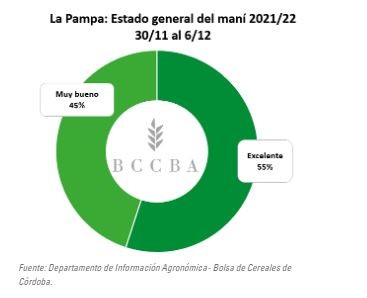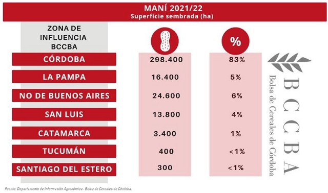 La superficie sembrada con maní alcanzaría 16.400 hectáreas durante la presente campaña. El 75 % del área ya se encuentra sembrada, transitando los primeros estadios vegetativos. Según el reporte de nuestros colaboradores, hasta los primeros días de diciembre el cultivo se encontraba en excelentes condiciones.