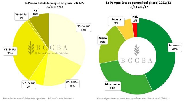 En líneas generales, el cultivo muestra una buena condición, con un 88 % del total en estado entre excelente y bueno. En contraposición con lo que puede observarse en otras regiones del país, en La Pampa el desarrollo de los cultivos se encuentra actualmente condicionado por el exceso de agua, ya que las últimas lluvias causaron anegamiento en diferentes regiones de la provincia.