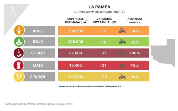 Durante el trimestre comprendido por los meses de septiembre, octubre y noviembre de 2021 las precipitaciones fueron mayores al promedio histórico para la mayor parte de la zona agrícola de La Pampa. Esta situación permitió a los productores comenzar la siembra con buen ritmo. Posteriormente, las lluvias continuaron en diciembre causando anegamientos que detuvieron la siembra y provocaron algunos daños en los cultivos establecidos.