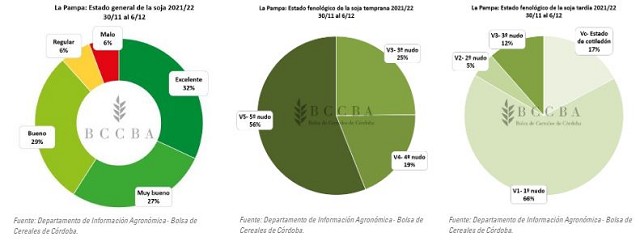 Con 398.600 ha sembradas con soja en la provincia, el avance de siembra a los primeros días de diciembre alcanzaba el 62 %. Este valor comprende al 17 % de soja sembrada temprana (antes del 15 de noviembre) y al 83 % de soja tardía (después del 15 de noviembre). Aquellos lotes cultivados en fechas tempranas muestran un desarrollo fenológico de entre 3 y 5 nudos, mientras que la soja tardía está entre estado de cotiledón hasta 3 nudos.