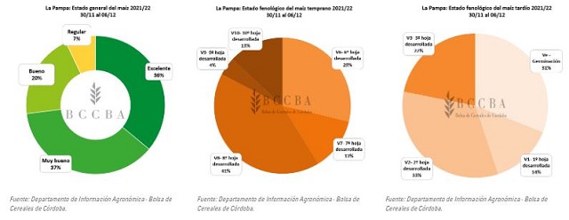 Con una estimación de 739.500 ha sembradas con maíz en la provincia de La Pampa, se prevé que el 25 % del total se sembró en fechas tempranas (antes del 1° de noviembre). Esa fracción del cereal se encuentra avanzando en sus estadios vegetativos, con entre 6 y 10 hojas desarrolladas. El maíz tardío, por otra parte, corresponde al 75 % del total y la siembra aun no finalizó, con la superficie en pie germinando o hasta con 3 hojas desarrolladas. Así, el avance de siembra a nivel provincial alcanza el 54 % de la superficie.