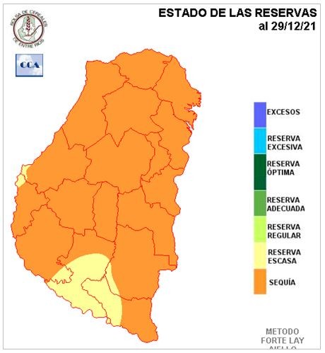 Teniendo en cuenta que durante el mes de noviembre, las lluvias sobre la provincia de ER a lo sumo alcanzaron valores normales, es lógico ver un mapa de reservas con un fuerte avance de la sequía. Independientemente de que por sectores la disponibilidad de humedad pueda ser mejor, la escasez se impone como un fuerte condicionante para los cultivos en floración y el panorama también se vuelve hostil para los cultivares de soja, teniendo en cuenta las altas temperaturas que se vienen concretando esta semana.