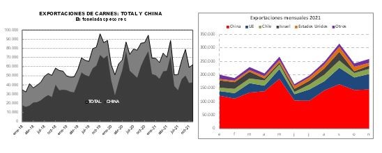 China ha continuado liderando las exportaciones de carnes bovinas, aunque cedió considerablemente en su participación: promediaba un 80% antes de las restricciones aplicadas, para alcanzar el 64% en septiembre y mantenerse en el orden del 70% desde entonces.