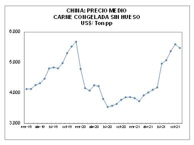 En noviembre, los embarques de carnes congeladas hacia China sumaron 30 mil toneladas peso producto, 7.3 mil toneladas fueron productos con hueso, un volumen que fue 30% menor a la media de los primeros cinco meses de 2021