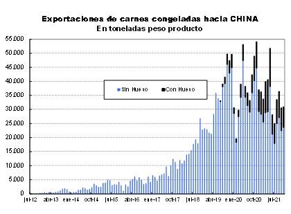 Después del pico registrado en mayo último, que con 52 mil toneladas incluyó un volumen récord de carne congelada con hueso de 13.5 miles de toneladas, las exportaciones a China retrocedieron a 28 mil y 25 mil toneladas en junio y julio, respectivamente, para oscilar entre 30 - 36 mil toneladas en los meses siguientes, con una participación relativamente estable del rubro con hueso de entre 8 – 9 miles de toneladas