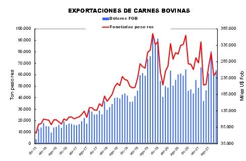 En noviembre de 2021, las exportaciones de carnes bovinas sumaron 43 mil toneladas peso producto, equivalentes a 62 mil toneladas peso res, 5% más que el período anterior, aunque un 34% menor comparando con doce meses atrás. Entre enero y noviembre del año en curso, se han embarcado 738 mil toneladas peso res que reportaron 2523 millones de dólares, una baja del 11% en volumen y similar valor que en igual lapso de 2020. La mejora de las cotizaciones en destinos claves como China y la Unión Europea se ha conjugado con la mayor incidencia de los contingentes arancelarios - que incluyen los cortes más preciados - contribuyendo en estos resultados.