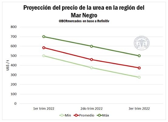 Las perspectivas para el año próximo indican que se sostengan elevados los precios para el primer semestre, con una tendencia a la baja a partir de los segundos seis meses. Tomando datos de una encuesta realizada trimestralmente por la consultora Refinitiv entre diversas consultoras, las previsiones para el precio de la urea en la región del Mar Negro para los tres primeros trimestres del 2022 indican una clara tendencia bajista. En el siguiente cuadro se presentan los datos del promedio y los límites máximos y mínimos de la encuesta. Se puede apreciar que, si bien la dispersión de precios es considerable, es coincidente la visión de una propensión a una caída en los precios.