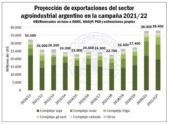 En cuanto al valor de las exportaciones para el ciclo 2021/22, a los precios vigentes dejaría como saldo un ingreso de divisas de US$ 38.400 millones. Ello es, US$ 400 millones más que el ciclo anterior y marcando un récord histórico para el sector. No obstante, si bien los volúmenes exportados serían mayores, los precios de exportación proyectados para los principales productos caerían levemente en el próximo ciclo, lo cual compensa en parte el incremento en cantidades.
