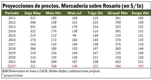 Respecto de los precios de los principales granos para 2022, las proyecciones prevén que se sostengan en valores elevados en términos históricos, pero levemente por debajo de los precios registrados en el 2021. Tomando los precios a cosecha de los principales granos, sólo el maíz tardío se ubicaría levemente por encima del precio registrado en el último año hacia esas fechas, mientras que la soja, el maíz temprano, el trigo, el girasol y el sorgo se ubicarían algo por debajo de los precios del 2021.