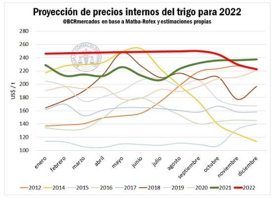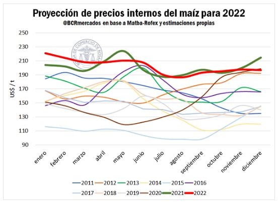 En el caso del maíz, los precios comenzarían en año en valores récord, para luego quedar por debajo de los precios del 2021. Además, tal como ocurrió en el año que termina, el ingreso del maíz tardío al mercado haría caer estacionalmente los precios entre los meses de julio y septiembre.