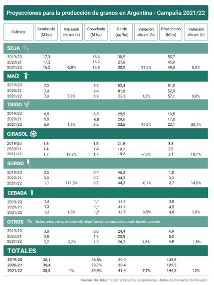 Por último, los otros cultivos (alpiste, arroz, avena, centeno, mijo, trigo candeal, cártamo, colza, maní, algodón y porotos) exhiben una leve caída en el área hasta las 3,7 M ha (-3,2%) y se obtendría una producción conjunta de 4,9 Mt. De esta manera, en la 2021/22 se encamina a una cobertura de siembras total de 38,8 M ha entre los diferentes cultivos, y una producción total de granos de 144,5 Mt, ambos récords históricos.