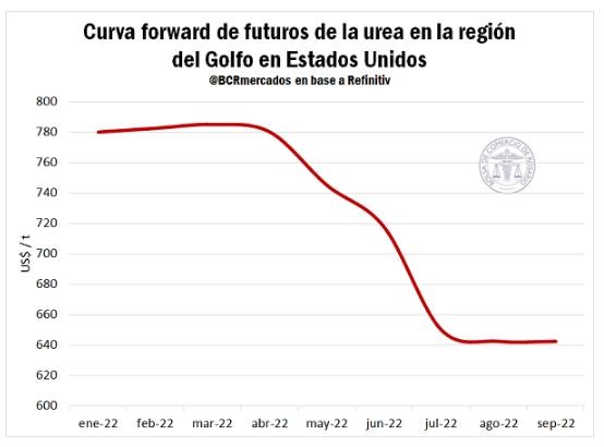 Un panorama similar se vislumbra si observamos la curva forward (es decir, la curva que se arma con los precios de los futuros con vencimientos en cada mes del año próximo) de los futuros de la urea en la región del golfo de Estados Unidos. Tal como se puede apreciar en el siguiente gráfico, los precios de los futuros de la urea tienden a sostenerse en niveles elevados durante el primer trimestre, con una clara tendencia a la baja a partir del mes de mayo.