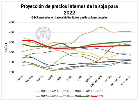 Siguiendo con la soja, al igual que con los granos amarillos, los precios comenzarían el año en niveles superiores a los del 2021. Sin embargo, con el comienzo de la campaña en abril descenderían estacionalmente para quedar debajo de los precios del 2021 y sostenerse cercanos a éstos, pero siempre en niveles inferiores a los del último año.