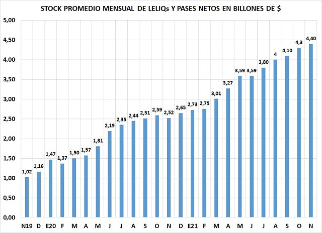 Este déficit fiscal lleva a una fenomenal expansión monetaria y de deuda del BCRA y del tesoro. El déficit fiscal hasta el mes de noviembre fue financiado casi en un 80% con emisión monetaria.