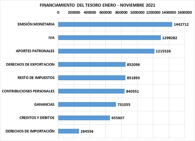 Es más, la emisión se ha transformado en el principal ingreso tributario, considerando la emisión como el impuesto inflacionario no legislado. En efecto, el período enero-noviembre 2021 la emisión monetaria por Adelantos Transitorios y por Transferencias de utilidades fue el ingreso más importante del tesoro aun incluyendo los DEGs que el FMI el transfirió a Argentina en forma excepcional, como al resto de los miembros del FMI.