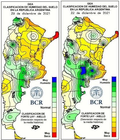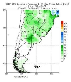 50 mm se necesitan para aliviar la situación de stress termohídrico de la región. Ingenieros y productores del área en todo momento hablan de las lluvias del fin de semana. Hay una enorme expectativa: “si se dan, mejoraría todo”, dicen. Pero, ¿va a llover? Sí, el problema es que no será lo que se espera. “Habrá fenómenos aislados y erráticos con grandes diferencias de registros en zonas muy acotadas”, dice Elorriaga. Aiello lo afirma: “los próximos diez días no aportarán una oferta de agua que satisfaga los requerimientos de la región núcleo. El primer día del 2022 aumentarán las condiciones de inestabilidad y pueden desarrollarse algunos fenómenos menores pero muy puntuales y poco generalizados en cobertura y volumen”. La NOAA proyecta hasta el 8 de enero para la región central 5 a 15 mm con los mayores concentrados sobre el norte de La Pampa, lluvias que se han concretado desde la tarde del día 29, y que indican que el pronóstico tendería a cumplirse.
