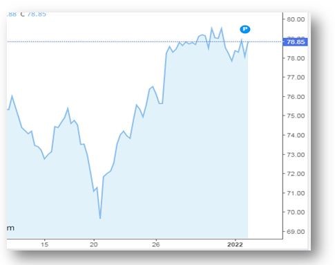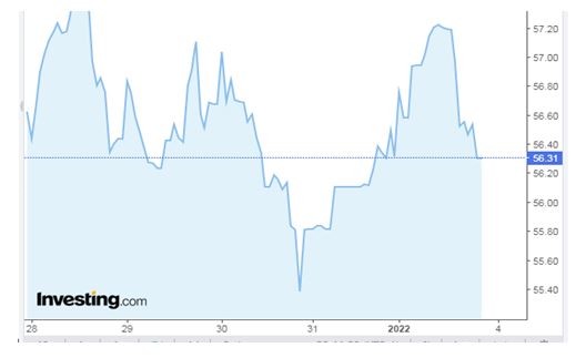 El gráfico que sigue (Investing.com) muestra los precios del Brent.