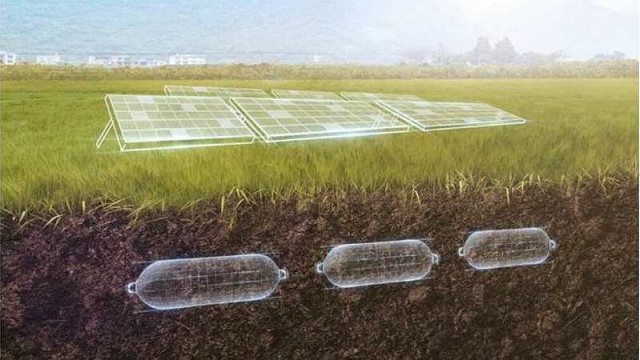 Durante el día, el exceso de energía de los paneles solares impulsa un sistema en el que el agua se usa para condensar el aire en tanques subterráneos. Al anochecer, ese aire se libera para alimentar una turbina y generar electricidad. Y el ciclo se repite por la mañana.