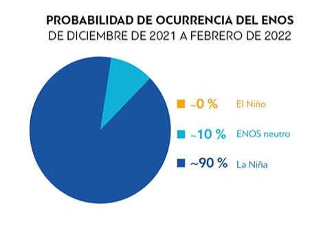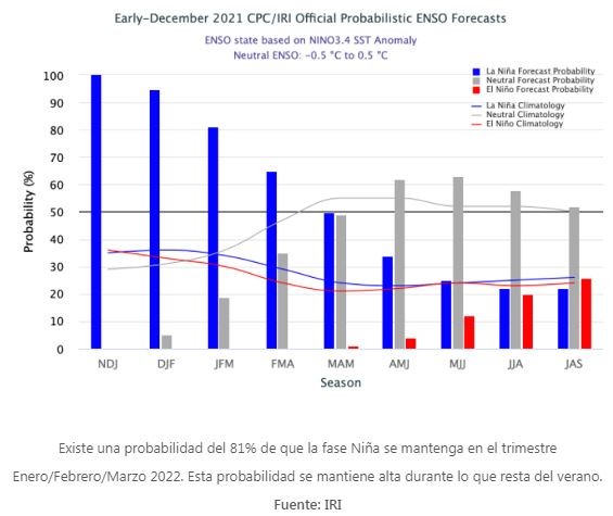 Existe una probabilidad del 81% de que la fase Niña se mantenga en el trimestre Enero/Febrero/Marzo 2022. Esta probabilidad se mantiene alta durante lo que resta del verano.