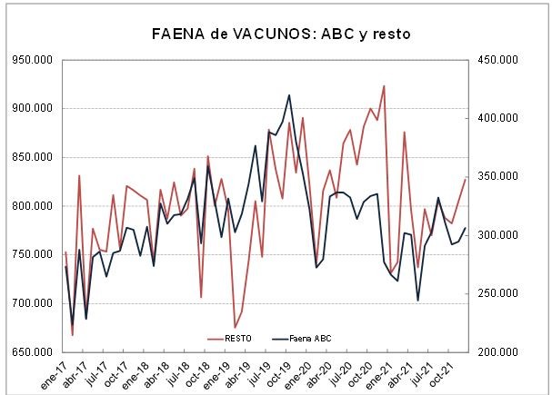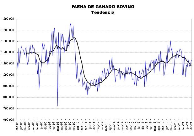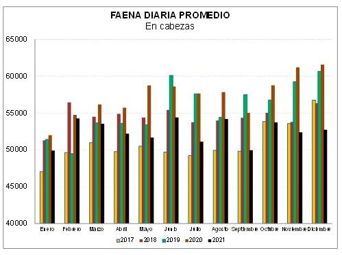 De acuerdo a datos proporcionados por la Dirección Nacional de Control Comercial Agropecuario (DNCCA), en Diciembre de 2021, la faena de bovinos alcanzó 1.13 millones de cabezas, 3 % por encima del período anterior. El año 2021 ha cerrado con una total de 12.966 miles de cabezas, una caída del 7 % comparado con el ejercicio anterior, la cifra menor desde 2017.