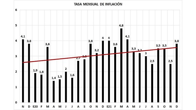Alberto Fernández tuvo una inflación del 3,8% en el primer mes de gobierno y dos años después sigue con un 3,8% de inflación en diciembre con varios picos más altos. En los primeros dos años de gobierno Alberto Fernández tuvo una inflación del 105% contra el 75% que tuvo Macri en sus primeros dos años de mandato ajustando las tarifas atrasadas.