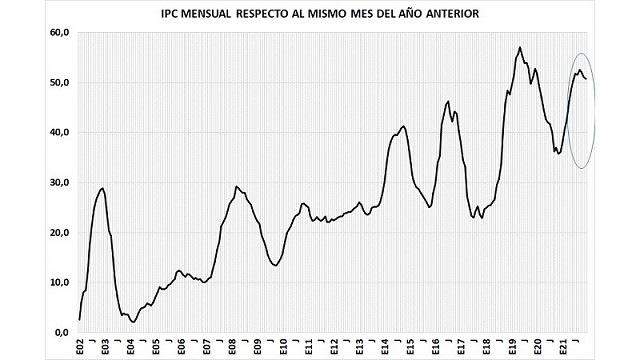 Como puede verse en el gráfico la línea de tendencia es claramente ascendente. Esta creciente inflación, que el presidente se empeña en decir que la inflación tiene varias causas, aunque no dice cuáles son esas varias causas, solo nombra la emisión y cuestiones psicológicas, pero el resto son un misterio.