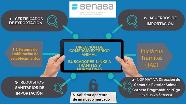 El Servicio Nacional de Sanidad y Calidad Agroalimentaria (Senasa) dispone en su página web oficial los accesos en línea a toda la información relacionada con la exportación e importación de animales y su material reproductivo (semen, embriones, huevos fértiles, ovas).
