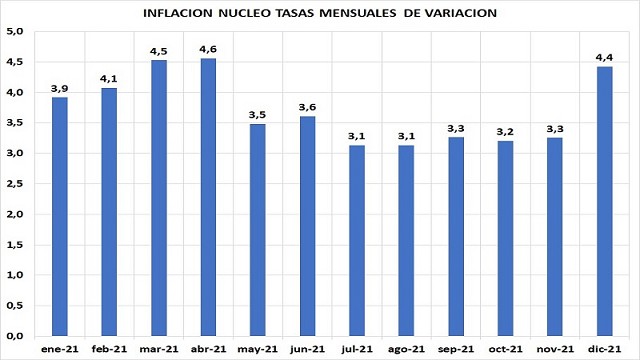 En diciembre pasado se batió récord de emisión monetaria para financiar al tesoro, pero solo mirando la base monetaria y tomando el promedio diario de diciembre de la base monetaria y comparándolo con el promedio diario de noviembre se observa un crecimiento del 8,6%, algo que se refleja en la inflación núcleo como puede verse en el gráfico 1. En diciembre se disparó la inflación núcleo frente a los meses anteriores que, por cierto, ya venía siendo alta, superando el 3% mensual.