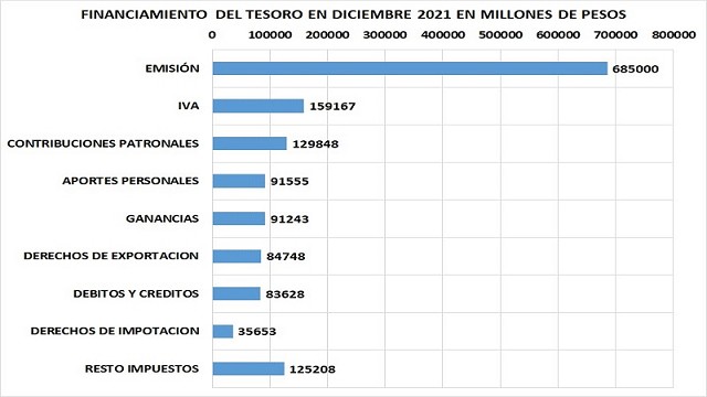 Es más, en diciembre fue récord la emisión para financiar al tesoro siendo el principal ingreso el impuesto inflacionario, seguido por el IVA, Contribuciones Patronales, Aportes Personales, etc. Es decir, el impuesto inflacionario fue 4 veces más grande que el IVA al momento de estimar los ingresos del tesoro, siendo que el IVA fue el impuesto que más recaudó para el tesoro.