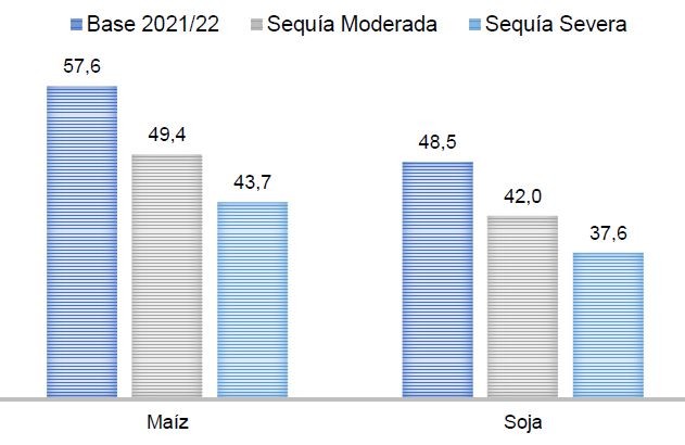 En el escenario base se estima una producción total de estos dos cultivos de 106,1 millones de toneladas, con 48,46 millones para soja, y 57,64 millones para maíz.