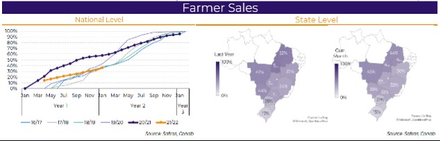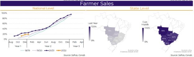 Para ponerlo en números, en Brasil, el ritmo de comercialización viene mucho más lento que la campaña pasada en soja y algo retrasado en maíz (ver grafico adjunto fuente Hedge Point): solo 40% de la oleaginosa ha sido vendida (vs 60% a igual fecha de 2021) mientras que en el cereal alcanza un 19%