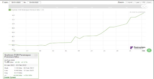 Para tomar dimensión de esto, las primas de soja FOB Paranagua saltaron de 50 cents/bushel los primeros días de enero a 125 cents/bushel el 4 de febrero (ver gráfico fuente: Agricensus), es decir, U$D 27 por ton.. El país que estaba llamado a inundar el mundo con soja y relajar los stocks globales tuvo un comportamiento totalmente contrario al esperado: generó una mayor firmeza y obligó a que China tuvieses que comprar soja americana para el mes de marzo para cubrir sus necesidades.