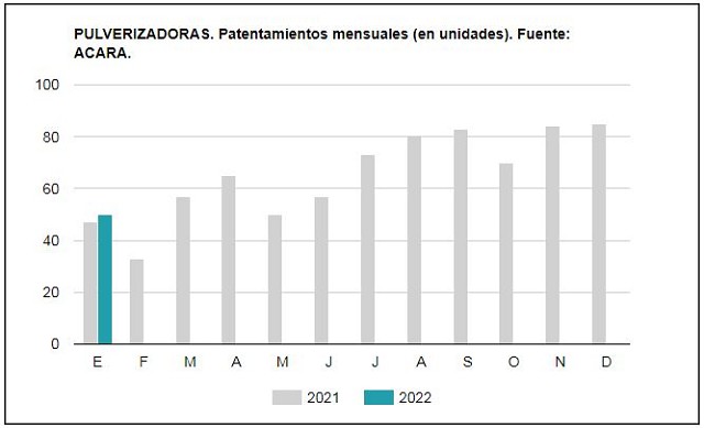 👉 Finalmente, en el segmento de pulverizadoras autopropulsadas se patentaron 50 unidades, con una suba de +6,4% respecto a enero de 2021 (47 unidades) y una baja de –41,2% en relación a diciembre (85 unidades). En el desagregado por marcas, la información de ACARA ubica en el primer lugar en enero a Pla (38%), seguida por Metalfor (24%), Caimán (20%) y Jacto (10%).