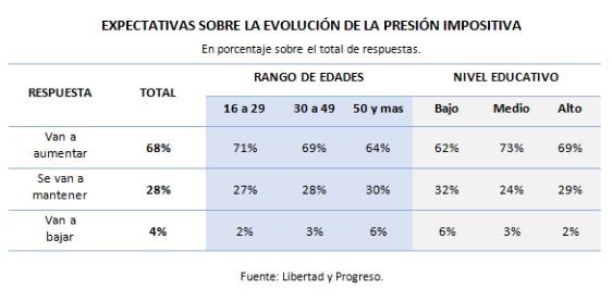 Las expectativas de que los impuestos sigan subiendo son más importantes en los jóvenes de 16 a 29 años. En este rango etario, 71% espera que los impuestos sigan subiendo. Mientras que para las personas de más de 50 años el porcentaje que espera subas de impuestos se reduce al 64%.
