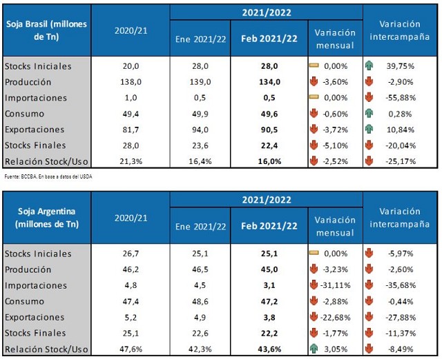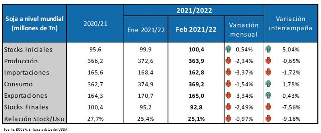En cuanto a las existencias mundiales finales, se proyectan en 92,8 millones de toneladas, cuando el mercado esperaba 91,5 millones de toneladas más. Los stocks finales en Estados Unidos alcanzarían los 8,84 millones de toneladas, valor por encima de lo que se esperaba.