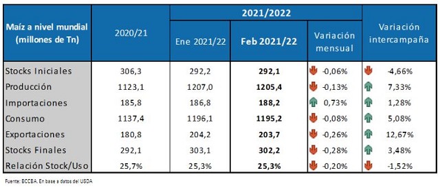 La producción mundial del cereal alcanzaría 1.205,4 millones de toneladas, siendo recortada respecto a la estimación anterior en 1,6 millones de toneladas. De esta manera, los stocks finales caerían y serían de 302,2 millones de toneladas. Este último dato es 1,9 millones de toneladas más alto que lo esperado por el mercado. Las existencias finales de Estados Unidos, por su parte, se proyectan en 39,11 millones de toneladas, 700.000 toneladas más de lo que estimaban los operados privados (38,41 millones de toneladas).