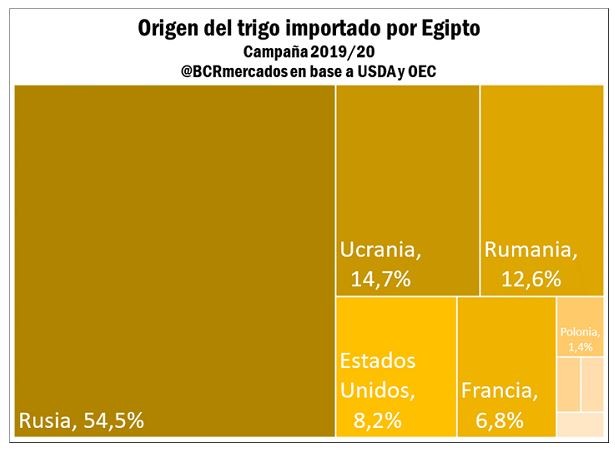 En los últimos años el país de los faraones importó más de 12 Mt de trigo en cada campaña, con expectativas de importar más de 13 Mt en la campaña 2021/22, lo que se proyecta como su mayor nivel importador en la historia. El origen del trigo que se importa hacia Egipto es eminentemente de la región del Mar Negro, con una importante participación no sólo de Rusia y Ucrania, sino también de Rumania.