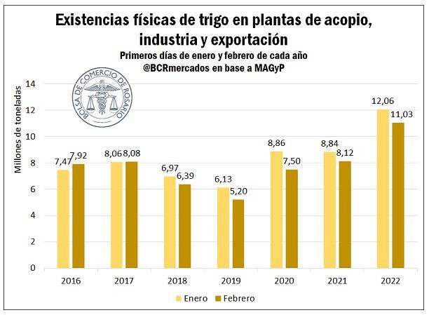 Si bien podría pensarse que la robusta cosecha 2021/22, máxima registrada en la historia, llevaría necesariamente a un volumen comercial récord, aún no es el caso. De hecho, para la última semana de enero la campaña 2019/20 mostraba un mayor nivel de ventas de trigo, con cerca de 15,6 Mt del cereal, casi un millón de toneladas más que el volumen comercializado actualmente.