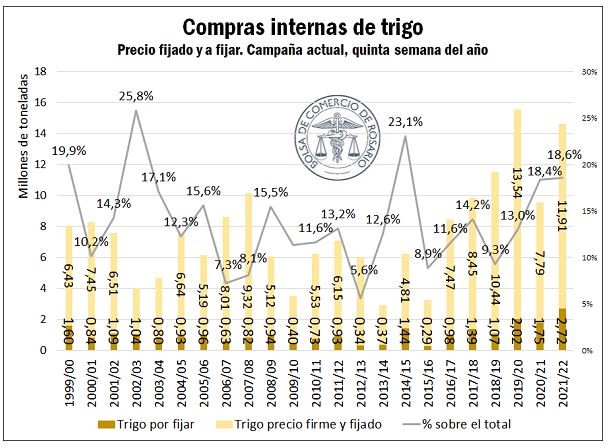 Del total con precio pendiente de fijación, el 85,7% corresponde a compras por parte de los exportadores, un porcentaje cómodamente superior al 68,6% de promedio de los últimos cinco años. Esta proporción sólo es superada por la campaña 2019/20, cuando casi el 88% de las compras sin precio fijado correspondían a la exportación de trigo, correspondiendo la parte restante a la industria molinera.