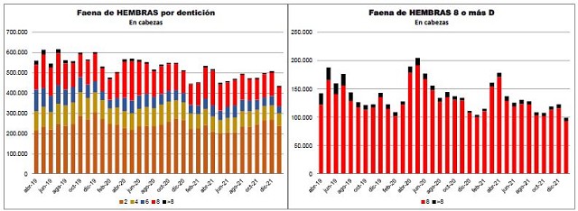 En el primer mes de 2022, la participación de hembras se mantuvo ligeramente por debajo del 45%. La decisión de establecer una excepción para las exportaciones de Vaca D y E se reflejó en un incremento de las hembras más añosas hacia fines de 2021, pero no se sostuvo en el mes comentado. “La faena de Novillos volvió a tener una caída, aunque fue relativamente menor a la de Vacas, cuya reducción fue el principal factor de la disminución de la faena total experimentada en el mes de enero, respecto del mes precedente ”, agregó Ravettino.