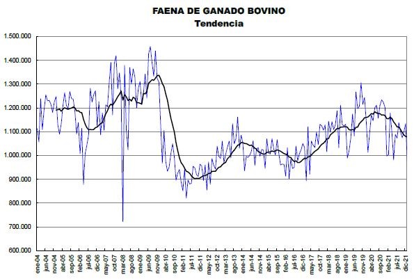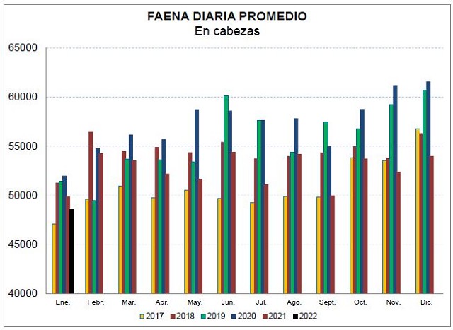 De acuerdo a datos proporcionados por la Dirección Nacional de Control Comercial Agropecuario (DNCCA), en Enero de 2022, la faena de bovinos alcanzó 972 mil cabezas, 14% inferior a diciembre de 2021 y 10% respecto del promedio de los meses de enero de los años 2002 – 2021.