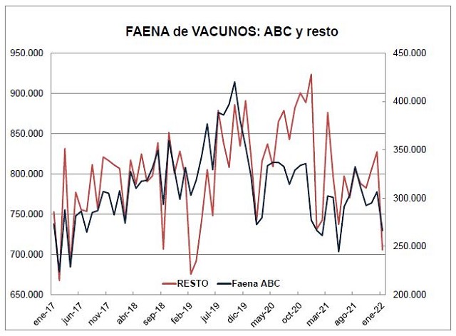Al considerar el número de días hábiles, si bien se atenúa la reducción, sigue siendo importante y sitúa a la faena de enero en una de las más bajas de los últimos años, con una brecha significativa si se la compara con los niveles verificados en 2019 -2020 (-15%). La faena cayó casi un millón de cabezas comparada con los doce meses acumulados a enero del año pasado.