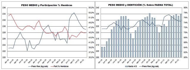 El peso medio de los bovinos faenados aumentó en el curso 2021: fue de 210 kg/cabeza para las hembras y 246 kg/cabeza para los machos, en ambos casos superan los guarismos de 2020, consecuencia de una reducción en el sacrificio de hembras y de la menor presencia de animales más livianos, que se dio a comienzos de este año. El resultado de ello es un promedio para el total de 228 kg/cabeza, 2 kg mayor a 2020. En el mes de enero de 2022, se igualó el nivel de diciembre de 2021, con un valor de 229 kg/cabeza, una cifra todavía muy alejada de los guarismos de nuestros competidores.