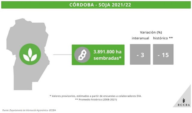 Con la totalidad de la superficie sembrada, se estima que en la provincia se alcanzó un área de casi 3,9 millones de hectáreas de soja durante esta campaña, con una baja del 15 % respecto al promedio histórico (2008-2021).