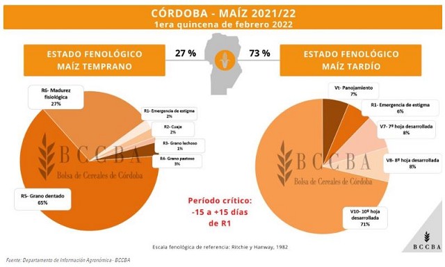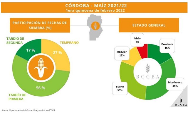 Luego de que el cultivo sufriera las variadas condiciones de sequía, altas temperaturas, vientos fuertes y granizo localizado ocurridas durante enero, con pérdidas que rondarían el 11 % de la superficie total, el estado general del mismo habría mejorado pasando de 36 % a 50 % de los lotes en estado entre muy bueno y excelente al mes de febrero.